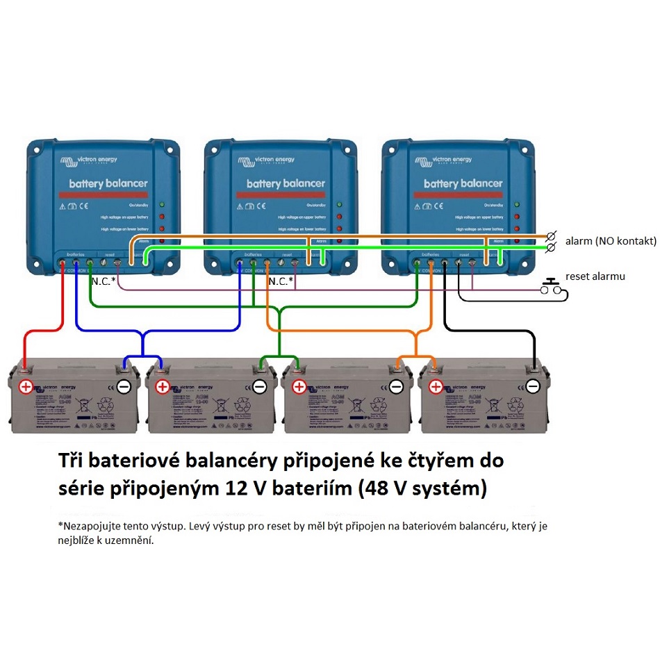 Bateriové balancery je možno řadit i paralelně u složitějších systému. U 48 V systému se tak použijí celkem tři balancéry (viz schémata).