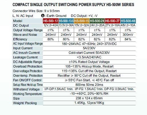 Parametry a specifikace: - AC Rozsah vstupního napětí zvolen pomocí přepínače; - Nízká hmotnost, vysoká účinnost; - Ochrany proti: Zkratu / přetížení / přepětí / teplotní; - Chladicí ventilátor ON-OFF: automatické regulace; - LED indikátor zapnutí; -