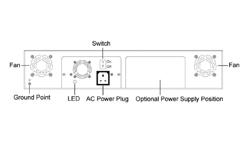 Case má pasivní backplane a sdílí napájení pro mediakonvertory - může mít až 2 napájecí zdroje - dodávaný střídavý nebo stejnosměrný.