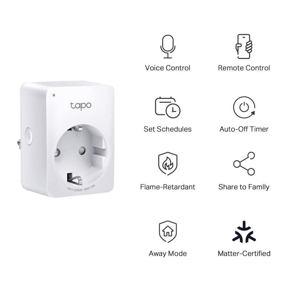 Chytrá zásuvka Tapo P100M od značky TP-Link vám usnadní život v domácnosti i v kanceláři. Poskytuje spoustu praktických funkcí, které si oblíbíte. Oceníte vzdálené ovládání, časovač, režim nepřítomnosti, jednoduchou správu a mnoho dalších vychytávek. Tapo P100M má kompaktní rozměry, abyste měli pohodlný přístup i k sousedním zásuvkám.