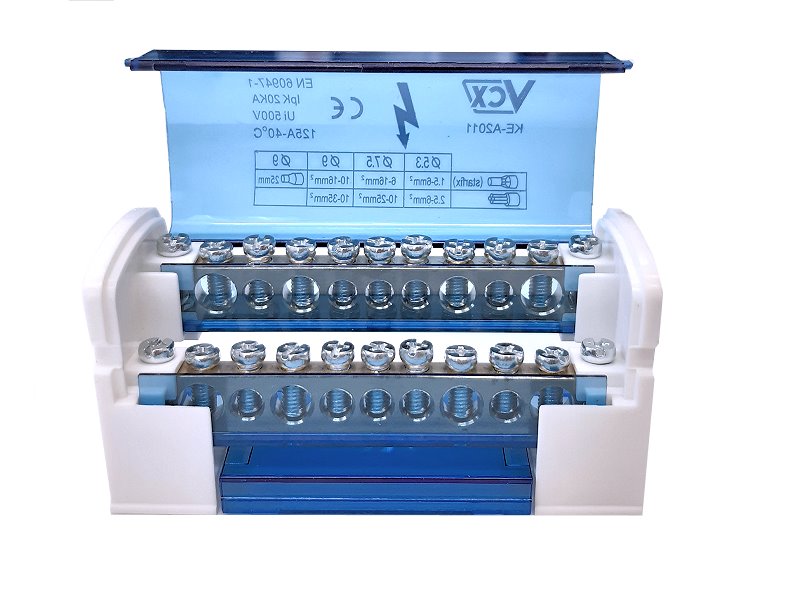 Distribuční blok VCX BLK 211 / 2 póly / 11 otvorů / 125A / na DIN lištu Distribuční nebo také rozvodný blok s mosaznými šrouby pro správné a přehledné připojení kabelů v nízkonapěťových rozvodnách. Modulární rozvodné bloky VCX jsou určeny k rozvodu