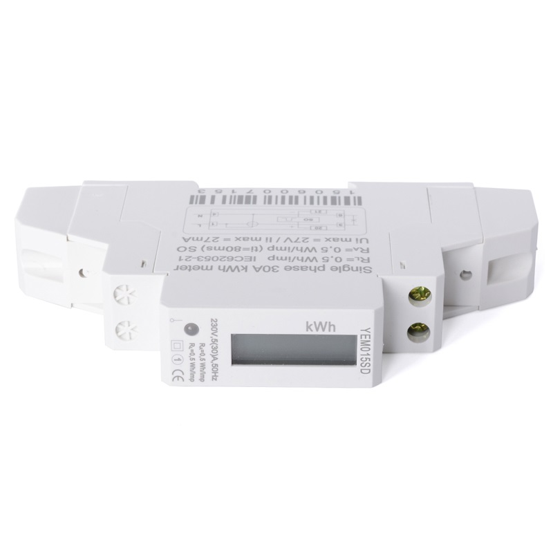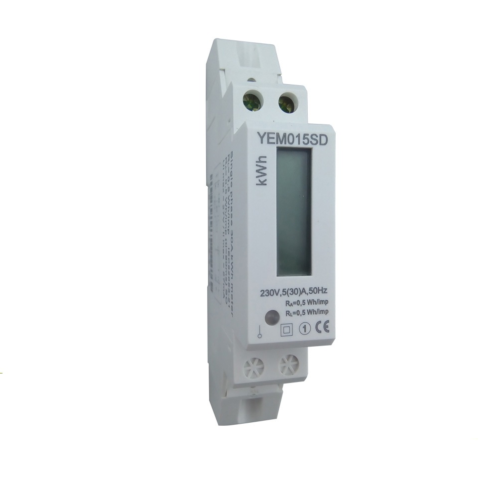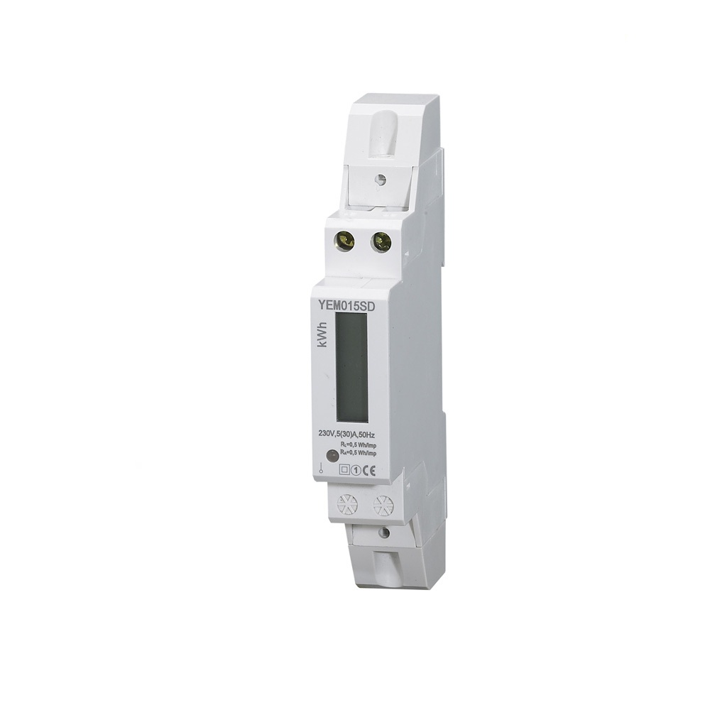 Elektroměr CARSPA YEM015SD na DIN lištu jednofázový digitální; Elektrická specifikace: Napětí: 230V ± 30%; Proud: 5 ~ 30A; Třída přesnosti: 1,0; Standard: IEC61036; Frekvence: 50/60Hz; Impulsní konstanta: 1000imp/kwh; Režim zobrazení: - LCD5 + 2 =
