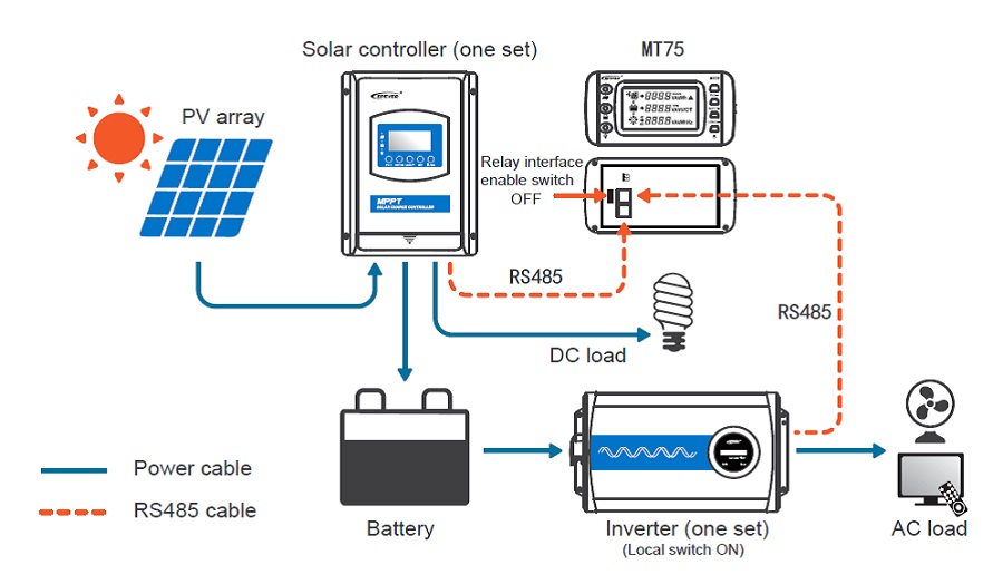 MT75 je nová generace vzdáleného ovladače, který dokáže monitorovat MPPT solární regulátor a současně i měnič napětí na jednom displeji. Samozřejmě může být použit pro monitoring pouze jednoho zařízení.