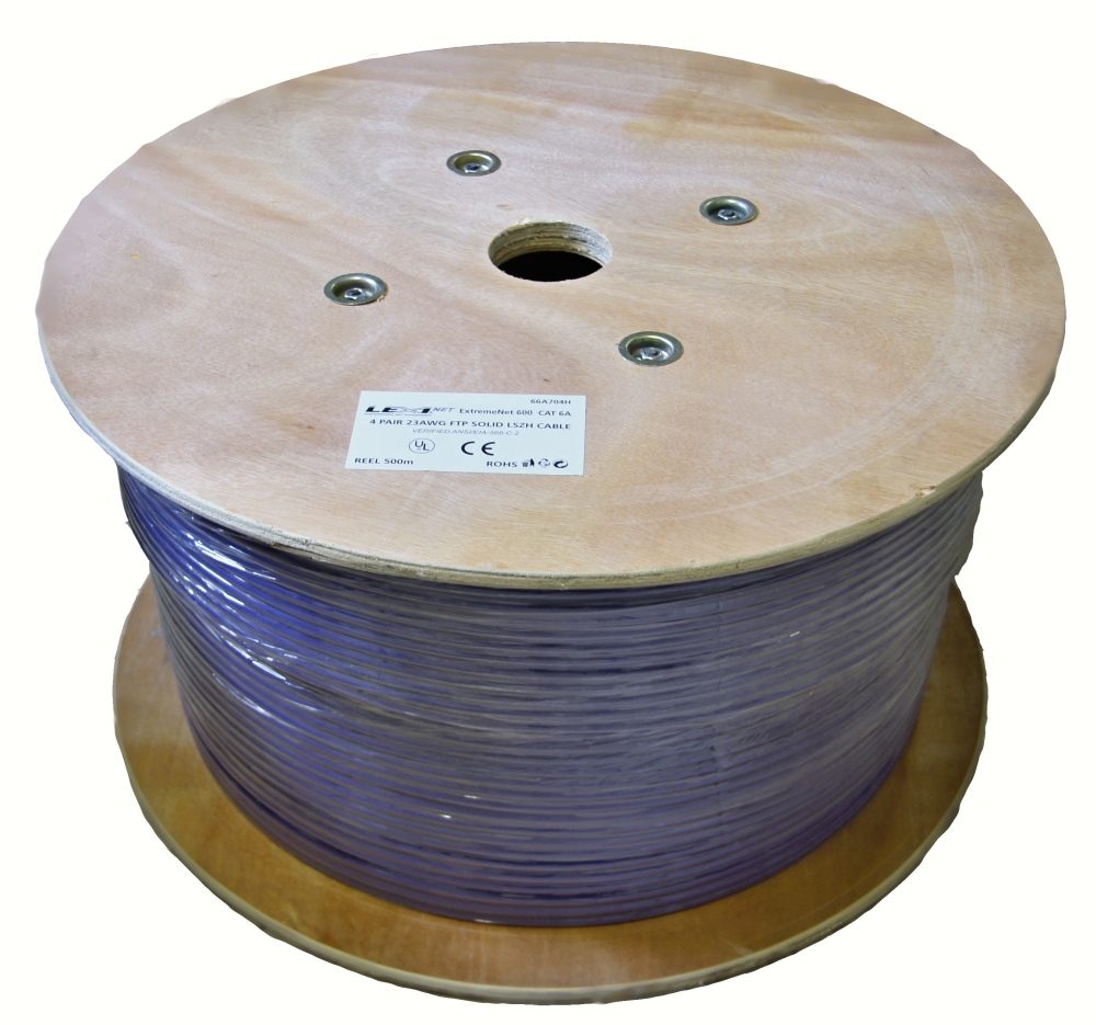 Kabel S/FTP 4 páry LSZH fialový CAT 7 drát 23AWG čistá měď. Měrky po metrech, balení na dřevěných cívkách po 500m.