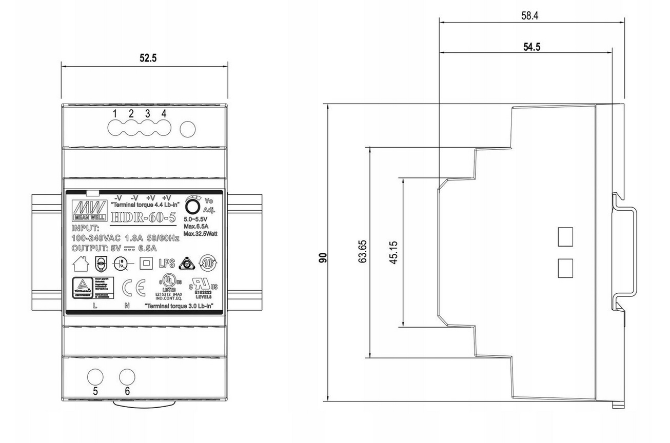 MEAN WELL HDR-60-24 průmyslový napájecí spínaný zdroj 24V 60W na DIN