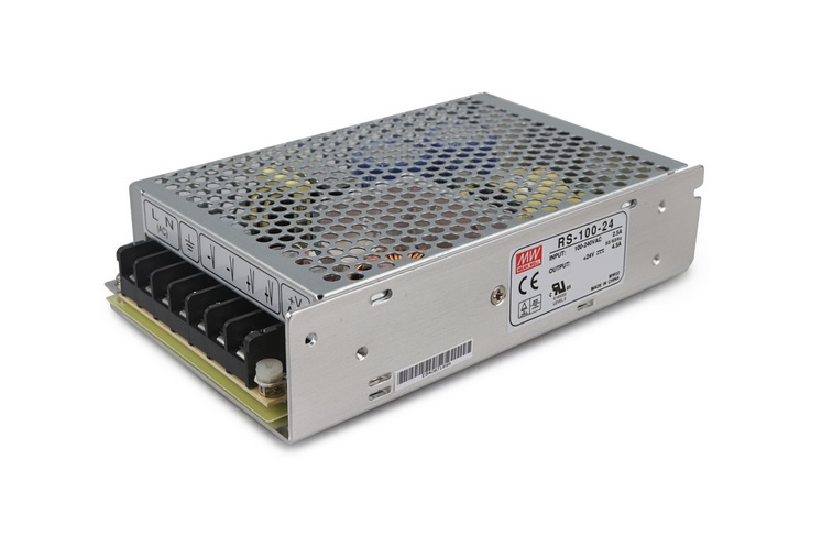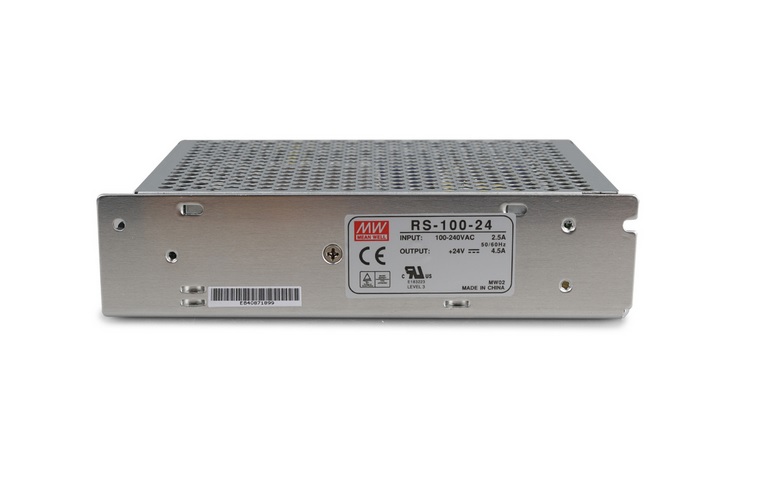 MEAN WELL RS-100-24 Spínaný zdroj uzavřený 100W 24V; Výstupní napětí: 24V; Regulace výstupního napětí: 22,8..26,4V; Výstupní proud: 4,5A; Skutečný výkon: 108W; Vstupní napětí AC: 88..264V; Odběr při 230V AC: 1,5A; Účinnost: 84%; Studený start: 40A;