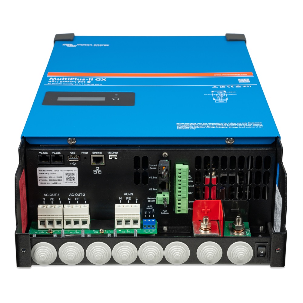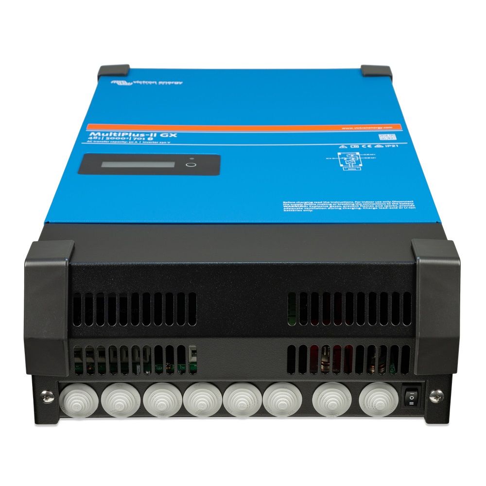 MultiPlus-II GX je multifunkční měnič/nabíječ s integrovanou jednotkou GX, s možností připojení externího snímače proudu, který rozšiřuje funkce PowerControl a PowerAssist, ideální pro použití v ostrovních a ESS systémech. Má také všechny funkce jednotky MultiGrid se zabudovanou anti-islanding ochranou na svém AC vstupu – zesílená ochrana zabránění nežádoucím dodávkách do distribuční sítě v případě jejího výpadku.