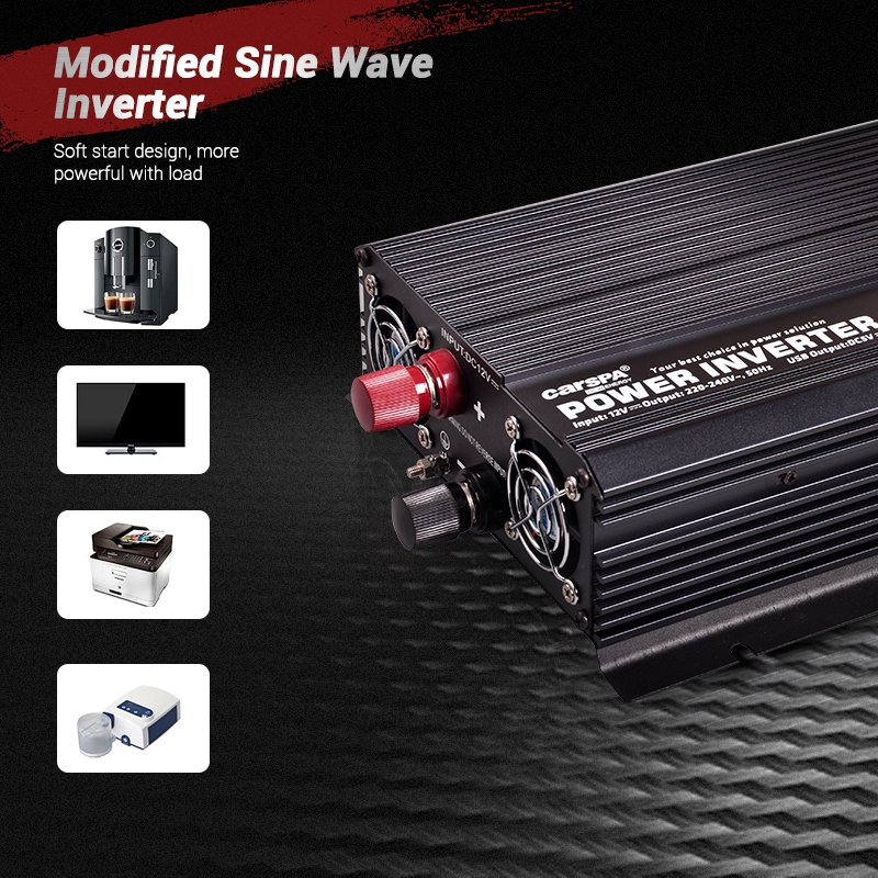 Měniče Carspa jsou jedny z nejpopulárnějších zařízení na trhu. Měnič transformuje stejnosměrný proud z 12V baterie na střídavý proud 230V. Díky tomu můžete používat své oblíbené spotřebiče např. nabíječky kamer, foťáků, mobilních telefonů, tabletů, notebooků a jiných zařízení až do výkonu 1000W i v místech, kde není dostupná rozvodná elektická síť a jde tak o ideální řešení na cesty. Vhodný i pro rychlovarné konvice nebo mikrovlnné trouby do výkonu 1000W.