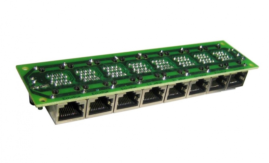 Panel integrující 8 pasivních POE injektorů vhodný pro napájení až osmi zařízení. Do RJ45 konektorů na jedné straně se připojují ethernetové porty bez napájení (např. switch), na opačnou stranu se připojují zařízení, využívají napájení po ethernetovém