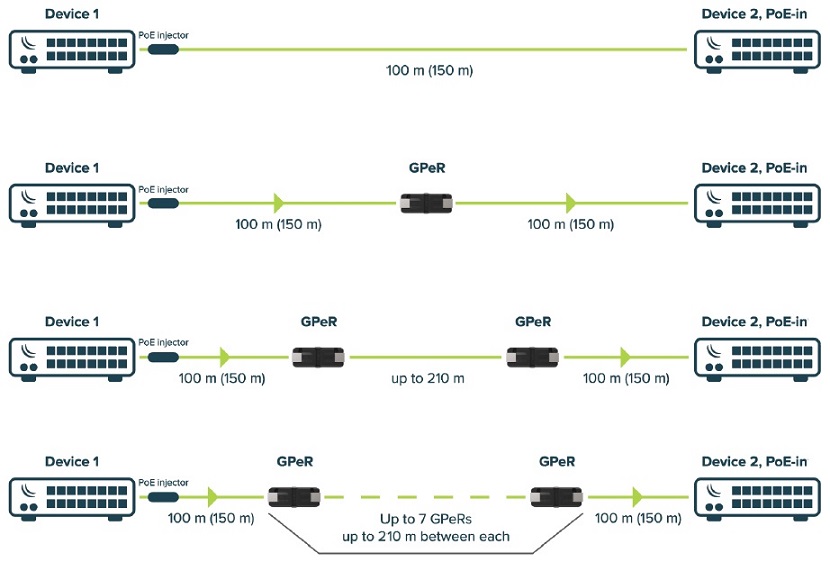 Maximální délka CAT6 Ethernet kabelu mezi GPeR jednotkou a zdrojem napájení/routerem je až 100 až 150m (dle kvality použitého kabelu). Maximální délka CAT6 Ethernet kabelu mezi dvěma GPeR jednotkami je až 210m (dle kvality použitého kabelu).