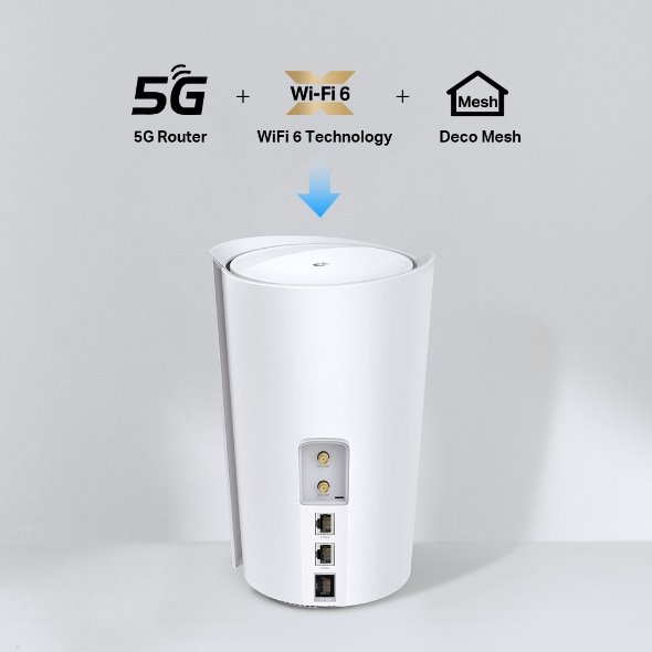 Modem (1-pack), technologie 5G s rychlostí až 3,4 Gbit/s, rychlé širokopásmové připojení, systém Mesh pro stabilní a kvalitní připojení, možnost propojit více jednotek, zabezpečovací systém TP-Link HomeShield, snadná aktivace, aplikace Deco.