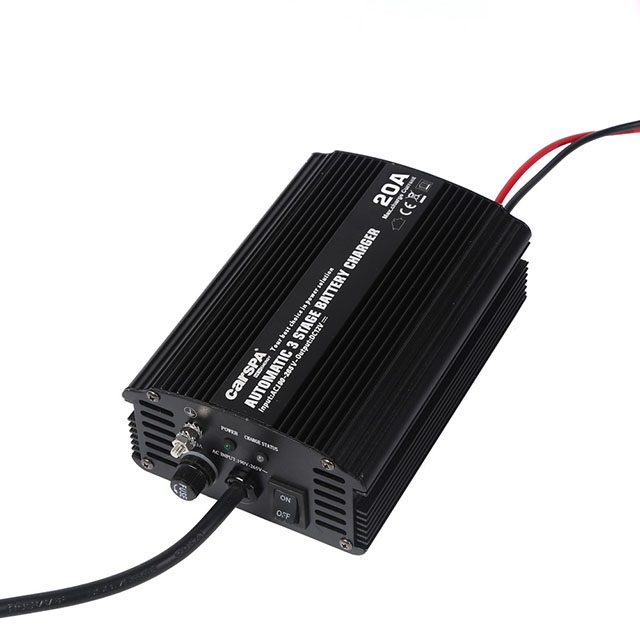 Nabíječka 12V/20A spínaná pro Pb aku, CARSPA ENC1220. Kvalitní a výkonná nabíječka olověných akumulátorů značky CARSPA s max. nabíjecím proudem 20A. Nabíječka Carspa obsahuje 3 automatické fáze nabíjení, ochranu proti přepólování, zkratu na výstupu, p