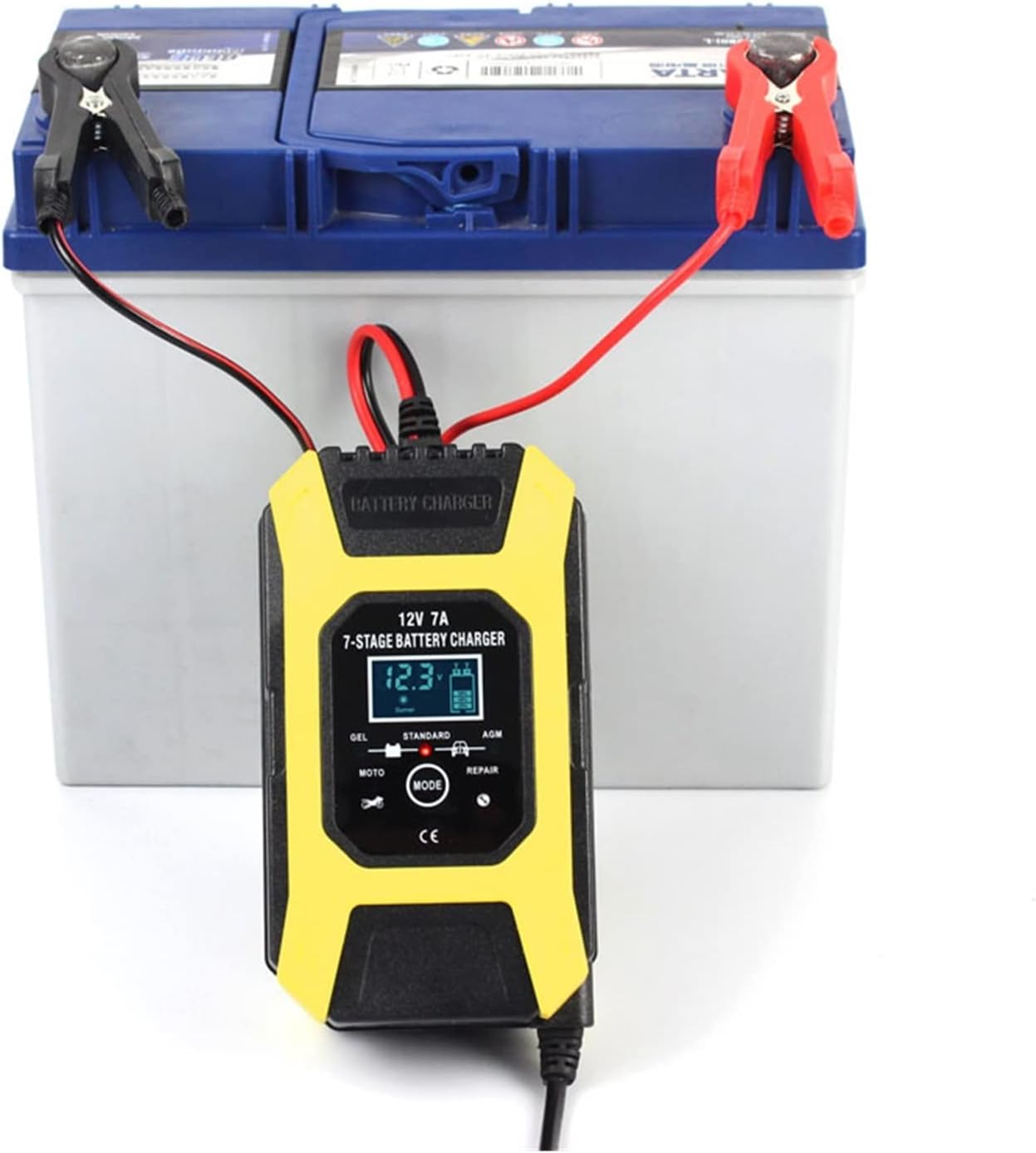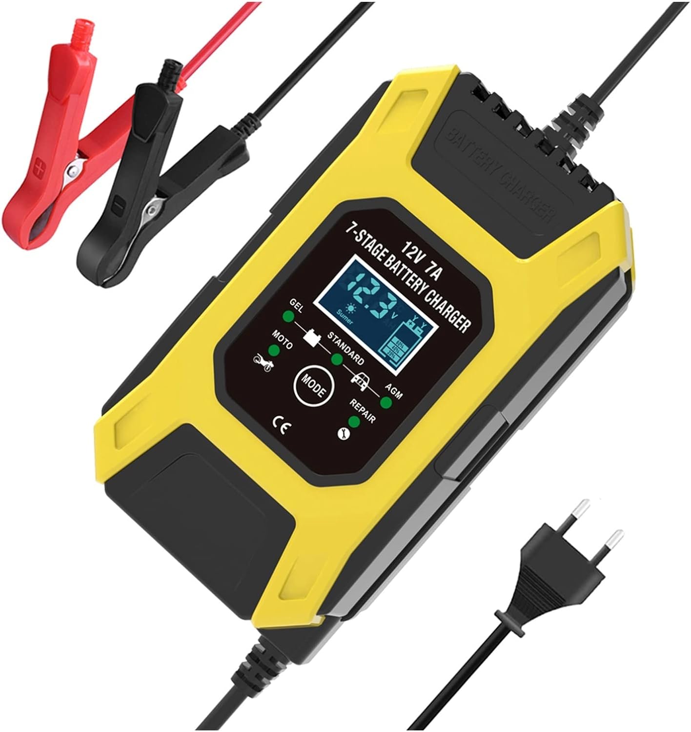 2) Zapojte nabíječku do sítě. Nyní máte cca 10sec na změnu režimu nabíjení (AGM, AGM GEL, STANDARD, MOTO, REPAIR) Poté nabíječka automaticky přejde do fáze nabíjení. Na displeji je zobrazováno svorkové napětí, nabíjecí proud a stupeň nabití.