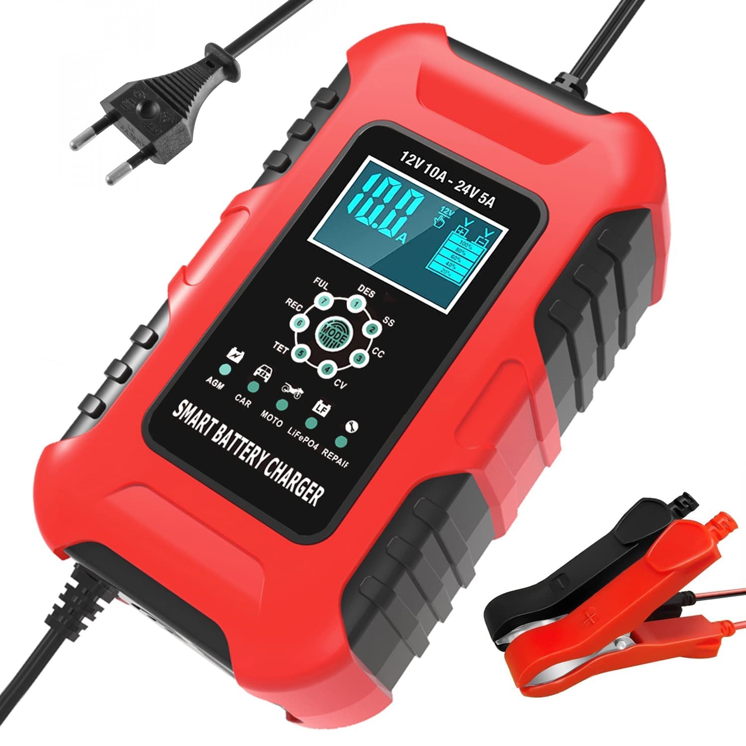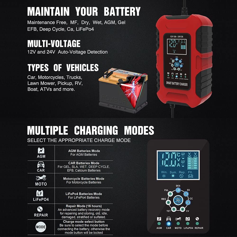 Chytrá, plně automatická nabíječka Pb a LiFePO4 baterií proudem do 10A umožňující trvalé propojení s nabíjenou baterií. Je vybavená programem pro regeneraci Pb baterií. 7stupňové nabíjení.