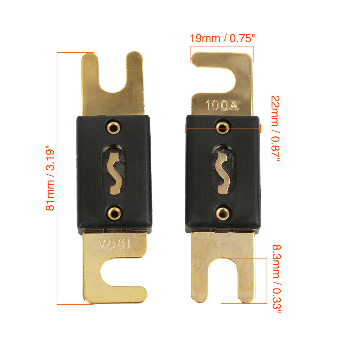 Pojistka plochá pod šroubky 100A. Použití například pro automobily, upravené vozy, čluny, audio a video systémy, solární a elektrické systémy a další
