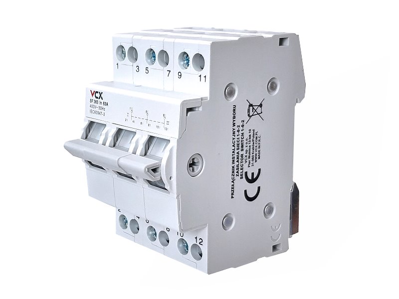 • Přepínač pro výběr síťového napájení VCX SF363, 1-0-2, 3P, 63A, na DIN lištu