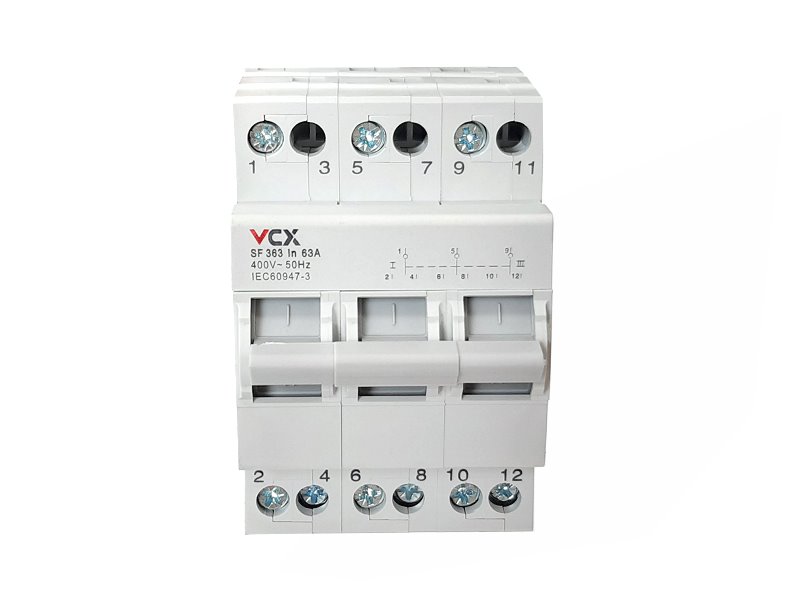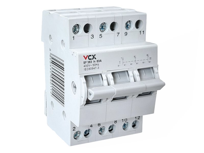 Přepínač pro výběr síťového napájení VCX SF363, 1-0-2, 3P, 63A, na DIN lištu