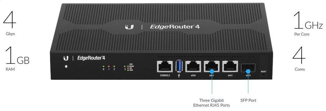 EdgeRouter 4 je vhodný všude tam, kde je nutné směrovat velké množství dat, do malých i středních firem a všude kde je kladen důraz na bezpečnost sítě. EdgeRouter je vybaven celkem 3x Gbit ethernetovými porty, 1x SFP, dostatečně velkou operační pamětí 1GB typu DDR3, úložným prostorem o velikosti 4GB a 1x USB 3.0. Celý provoz pak řídí čtyř-jádrový procesor taktovaný až na 1 GHz, MIPS64 s hardwarovou akcelerací pro zpracování paketů. EdgeRouter nabízí všechny základní funkce, které u routeru očekáváte.