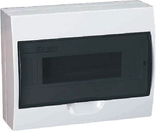 Rozvaděč TSM-12 plastový 1x12P nástěnný Rozměry: 148mm(D)x210m­m(V)x100mm(H) Kouřová transparentní dvířka Jmenovité napětí 400V Kovová DIN lišta Svorkovnice Krytí IP40 Třída izolace II