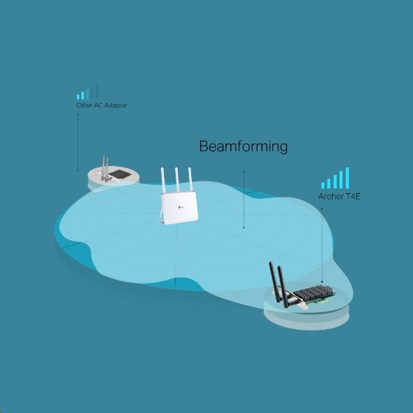 Technologie Beamforming inteligentně zaměřuje signály Wi-Fi na připojená zařízení pro stabilní připojení a zvýšený dosah.