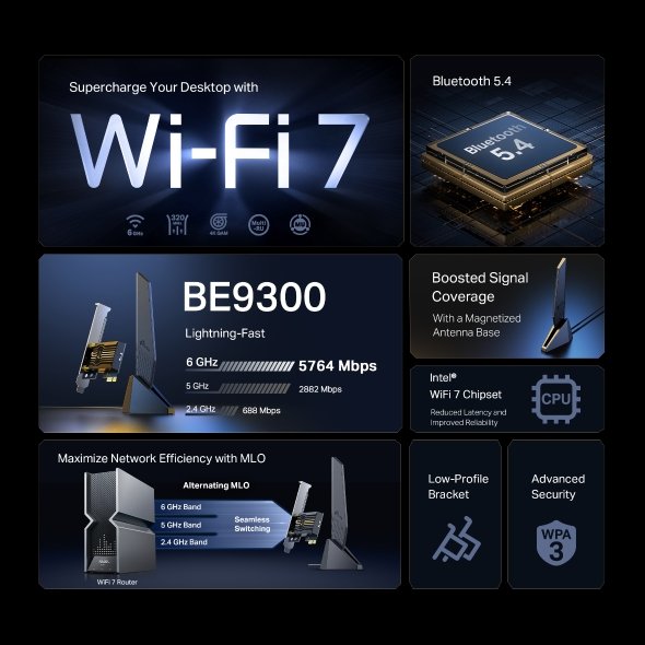 WiFi 7, rychlost až 9,3 Gb/s, PCIe, Bluetooth 5.4, 2,4/5/6 GHz, 2x anténa s magnetem, WPA3, Windows 10/11.