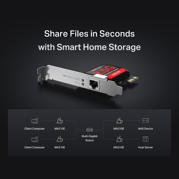 TP-Link Mercusys MA310E je výkonná PCIe síťová karta, která podporuje rychlosti 100 Mb/s, 1 Gb/s a 2,5 Gb/s. Díky flexibilní instalaci s plnou i nízkoprofilovou záslepkou ji snadno využijete v různých typech počítačových skříní.