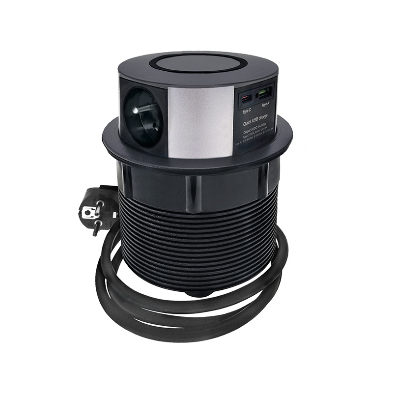 Tento výsuvný blok zásuvek přináší vše potřebné pro moderní pracovní plochu. Tři síťové zásuvky 230V, USB-A a USB-C porty s rychlým nabíjením a integrovaná bezdrátová Qi nabíječka s výkonem až 10 W tvoří kompaktní řešení pro každodenní používání. Stříbrné provedení vrchního krytu elegantně zapadne do pracovního stolu, kuchyňské linky nebo konferenční místnosti.
