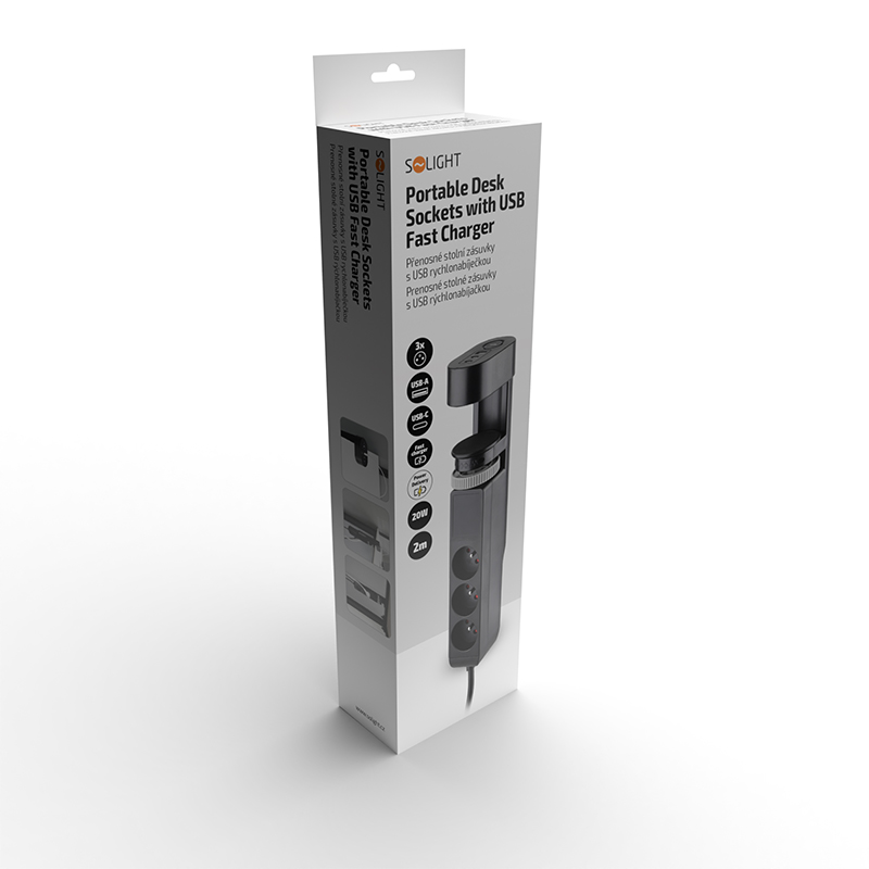 Solight 3z + USB A+C přenosné stolní zásuvky, 2m, černá, USB rychlonabíječka 20W PD