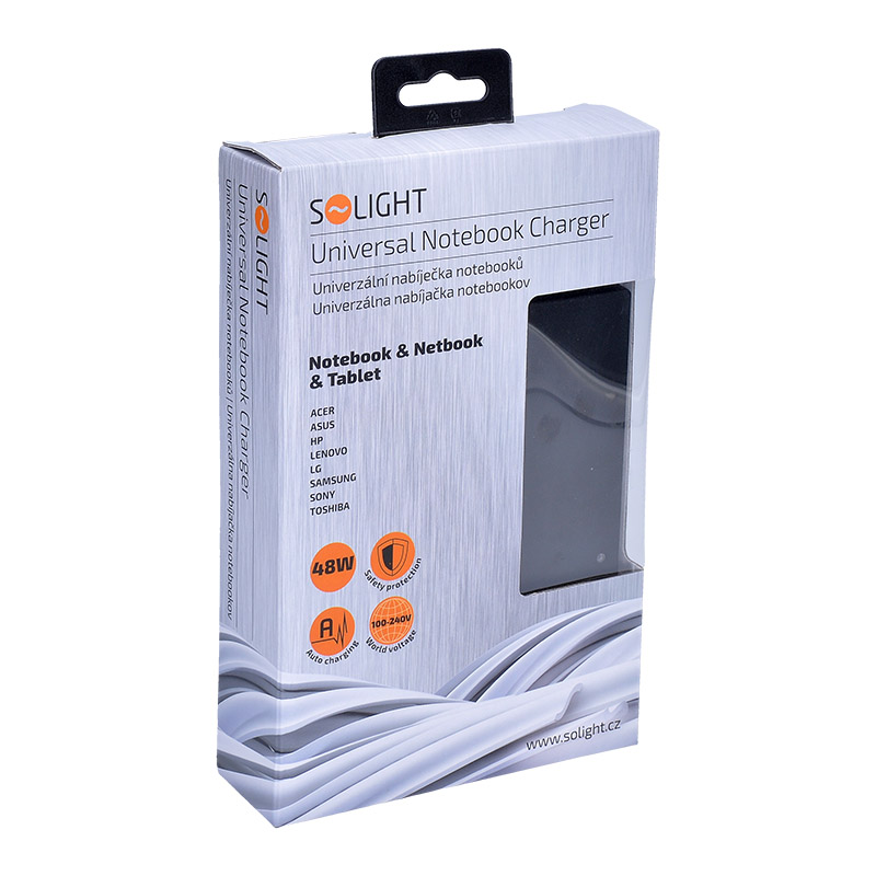 Solight univerzální zdroj pro netbooky a notebooky, 48W, 6 koncovek s automatickou detekcí. Technické parametry: Malé rozměry: DxŠxV: 10,8 x 4,5 x 2,5 cm Široký rozsah výstupního napětí DC 9,5 – 24V, 5A (max.), 48W Po připojení k zařízení automati