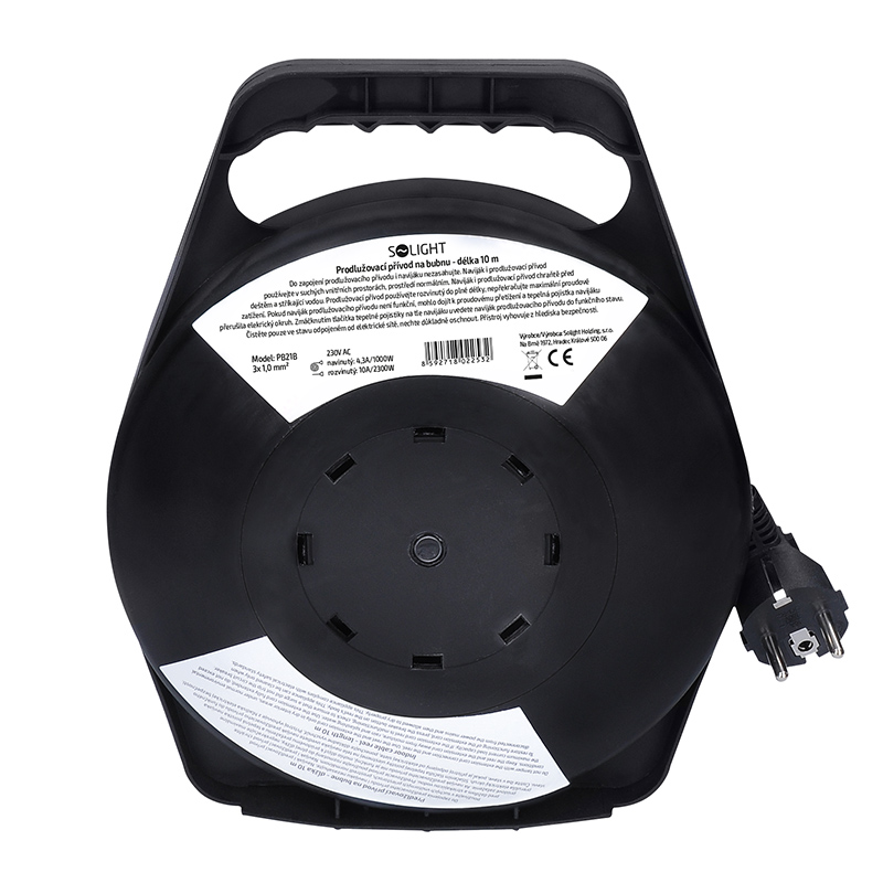 Solight PB21B prodlužovací přívod na bubnu, 4 zásuvky, 10m, černý kabel, 3x 1,0mm2 Parametry produktu: počet zásuvek: 4 průřez vodičů: 3 x 1,0mm2 typ kabelu: H05VV-F3 tepelná pojistka lomená vidlice barva: černá délka: 10m zatížení: 4.3A/1