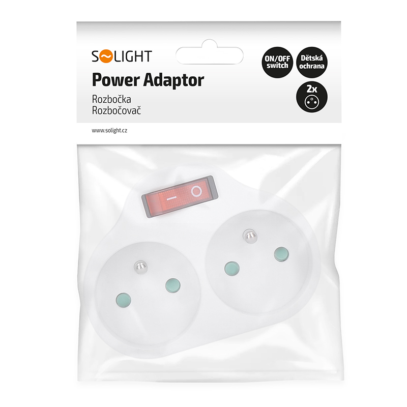 Solight rozbočka P97, 2x 10A, bílá, vypínač - výstup 2 x 10A/230V =>max. 16A - dětská pojistka - barva: bílá - vypínač Parametry produktu: Stupeň krytí (IP) IP20 Barva Bílá Počet zásuvek 2 Vypínač Ano