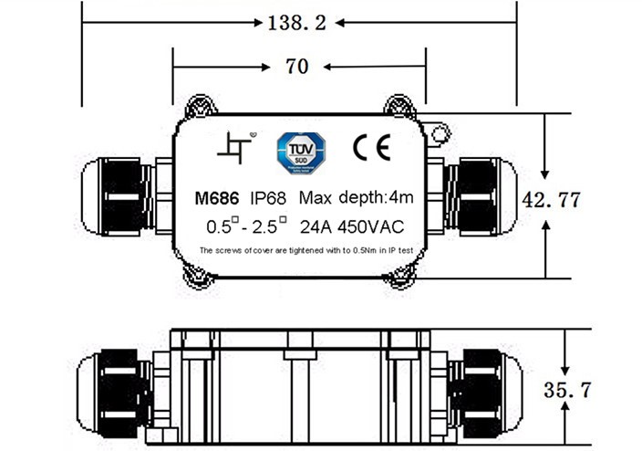 Vodotěsná propojovací krabička sloužící k propojení dvou a třížilových vodičů. Technické parametry: - počet kontaktů: 3; - počet vstupů: 1; - počet výstupů: 1; - maximální napětí: 450V AC; - maximální proud: 24A; - voděodolnost: IP68; - pro průměr