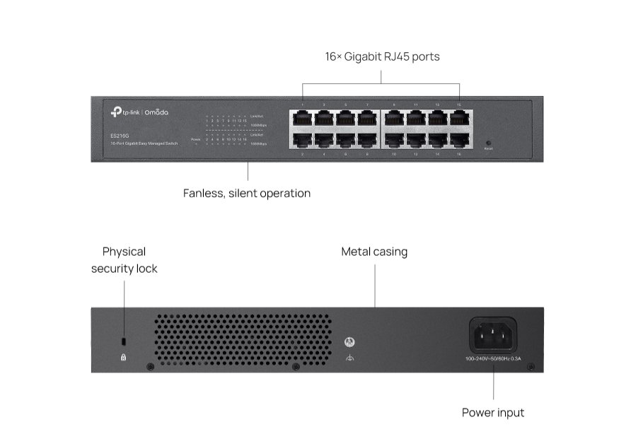 Switch ES216G je navržený pro profesionální, ale zároveň nenáročný provoz. Využijete jej jak v dohledových systémech, tak i v běžném firemním prostředí. Díky plug-and-play funkci je ihned připravený k použití, zatímco centralizovaná správa přes Omada SDN umožňuje pokročilé nastavení a monitoring. Bezventilátorová konstrukce zajistí zcela tichý chod a díky robustnímu kovovému tělu jej snadno namontujete do racku i na stůl.