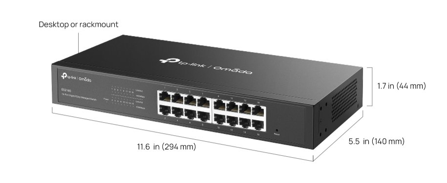 Switch od značky TP-Link, 16× GLan, správa přes Omada SDN, VLAN, QoS, tichý chod, odolné kovové tělo, možnost instalace na stůl i do racku, snadná instalace plug-and-play.