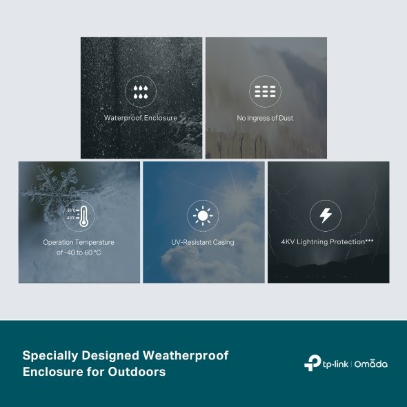 Switch TP-Link SG2005P-PD využijete ve venkovním prostředí. Je totiž vybavený krytím IP55, které ho chrání před povětrnostními vlivy. Jeho pouzdro odolá vodě, prachu, UV záření a dokonce je vybavené ochranou před bleskem (4kV).