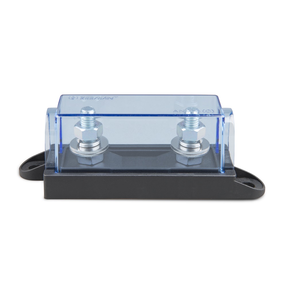 Držák pojistek Victron energy o maximálních proudech 60-500 A/ 32 V, nebo 125-300A/58V. Snímatelná krytka. Pojistky se v držáku připevňují na dvojici šroubů M8. Určeno pro připevnění na zeď nebo jiný pevný podklad. Standardně se umísťuje mezi akumulát
