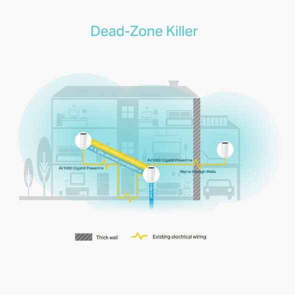 Třída bezdrátového připojení AC1200 + HomePlug AV1000. WiFi + PLC Hybridní síť účinně zesiluje šířku pásma. Technologie Powerline prochází zdmi díky elektrickým rozvodům, aplikace Deco, kompatibilní s amazon alexa.