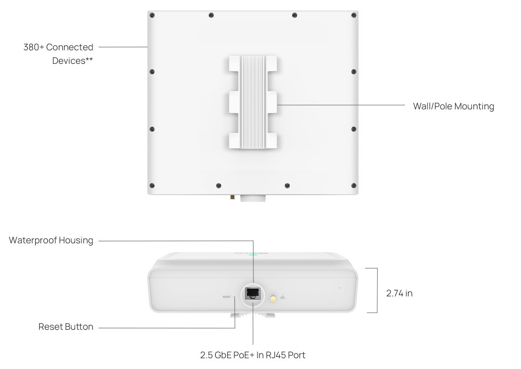 Venkovní Wi-Fi router s Wi-Fi 6, rychlost 3 Gb/s, IP68 krytí, směrové antény, PoE+, mesh, Omada SDN, venkovní použití.
