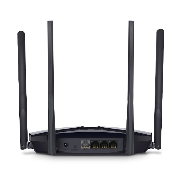 Dual-Band Wi-Fi 6 Router s 4 fixními anténami se ziskem 5 dBi, třemi Gigabitovými LAN a jedním Gigabitovým WAN portem. 2x2 MIMO, podpora MU-MIMO, 2,4 + 5 GHz pásmo 574 a 1201 Mbps, IPv6.